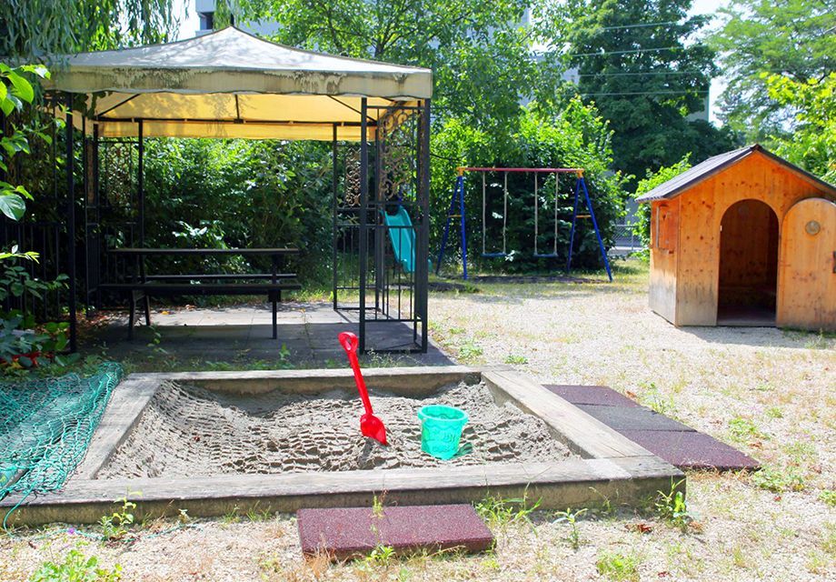 Terrasse und Garten mit Sitzplatz gehören zur Wohnung. Ausserdem gibt es in unmittelbarer Nähe der Wohnung einen Spielplatz, der von den Bewohnern der gesamten Wohnanlage genutzt werden kann.